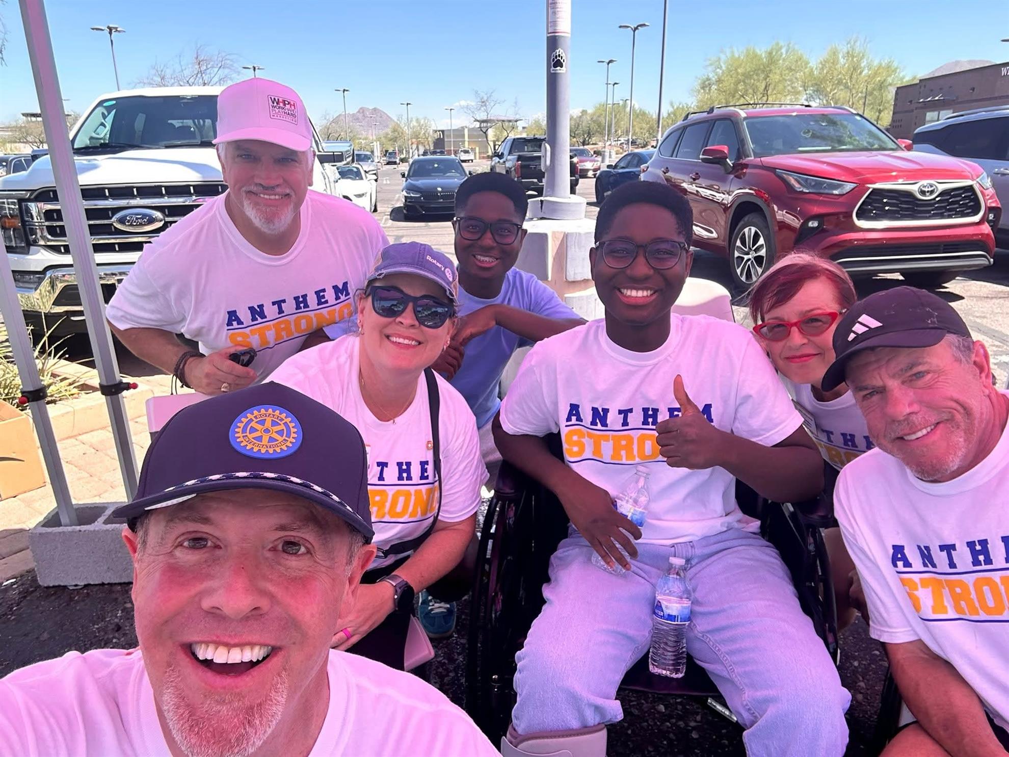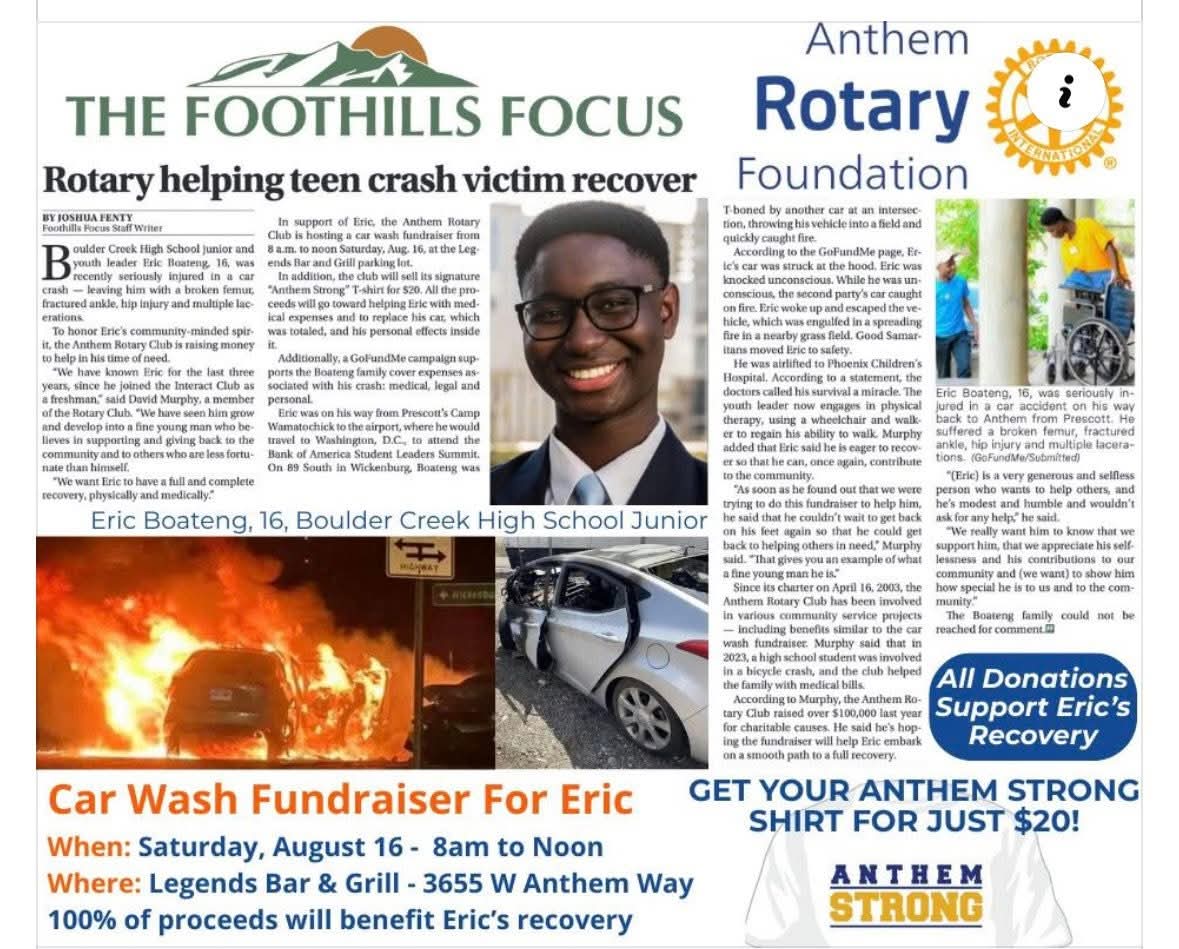 Pres. Jane Anne Shimizu with Tim Kneip, YC Athletic Director Tim Kneip, Yavapai College's new Athletic Director, gave an impressive presentation to our club about the YC Athletics program — where it has been in the past, and where he is determined to see it go in the the years ahead, now that he is in the driver's seat. Kneip says his mission as the AD is twofold: • His Academic Mission is for YC's student athletes to graduate with a 3.5 GP A. • His Athletic Mission is for YC to become the most dominant community college in the country. We spprecisted the opportunity to meet YC's new Athletic Director and to learn about his priorities and plans. We look forward to watching YC Athletics regain its former glory under Tim's positive leadership. Spreading Love and Kindness is a basic part of being a Rotarian. Treating the people we work wth, and do business with, each day with love and kindness should be one of the trademarks these people should be able to expect of those of us us who wear the Rotary pin. That should also charaterize the way we treat each other as fellow Rotarians and club members. In our rush to attend to necessary business, and in our determination to get jobs done, we don't always think about the fact that what we say, and how we say it, can offend and hurt the feelings of our co-workers. The fact is that we have lost members in the past because they have not been treated with love and kindness by their fellow Rotarians. This is something we need to work on. May one of our goals this year be to excel in appreciating our fellow members, and in treating them with trademark Rotary love and kindness. CLUB SERVICE Presenting the program at this week's club meeting will be our own Ives Devos, speaking about Antique Firearms. Some of our most interesting programs have been those when our members have shared their special interests and hobbies. For some of our newer members, you may not be aware that Ives splits his time each year between his home in Prescott and his home in Belgium, where he is also deeply involved in Rotary. We look forward to what Ives will have to say about this unique special intertst oif his. First Chili Cook-Off brainstorming session this WEDNESDAY at 6:30 a.m. Come early, sip some coffee that will be available, and share your ideas. The Chili Cook-Off will be held from 5:30-8:00 pm on Saturday, October 25, at Touchmark COMMUNITY SERVICE Beginning this Wednesday, Marsha Teller will be selling purple bracelets to support research for the Alzheimer's Foundation. In lieu of September's Alzheimer's Walk on September 27th, we will be selling bracelets at our Wednesday's meetings. They will be for a $5 donation, so bring your bucks. All donations from all Rotary Clubs will be sent to the Alzheimer's Foundation for research. Our goal is $500.00 Frontier Rotary is spearheading Rotarian participation in the Alzheimers Walk on September 27.. DISTRICT NEWS Several weeks ago we told our club members about the terrible car accident which Interact AG Eric Boateng had, trying at get home from the Interact District Council Retreat, in order to catch a flight to Washington DC, to participate in a national youth leadership conference. He is out of the hospital and is now undergoing physical therapy to enable him to walk again. As can be seen from the newspaper ad above, the Anthem Rotary Club called on their community to help Eric and his family with the mounting bills associated with his accident, his medical, legal and rehab bills. They scheduled a benefit car wash. Eric is seen above in his wheelchair at that car wash, surrounded by enthusiastic Anthem Rotary Club members. Our congratulations to Anthem Rotary and their supportive community. With their 4-hour car wash, they raised overc $10,000 to help Eric and his family. Anthem Rotarians have certainly proven they are Rotary People of Action who can get it done!!  I just saw on the news that they’re suggesting people check on the elderly. I’m usually up by 6 or 6:30. Bring donuts. __ Running into stationary objects can be painful, According to a recent pole. __ Smoking will kill you… Bacon will kill you… But smoking bacon will cure it. __ Bawk Bawk Bawk It’s the only thing chickens say. They just can’t think outside the Bawks! __ I recently opened a company selling trampolines disguised as prayer mats. Prophets are going through the roof. __ Someone asked me if I had plans for the fall. It took me a moment to realize they meant ‘autumn,’ not the collapse of civilization. __ The human brain is a wonderful thing. It starts working the moment you are born, And it never stops until you stand up to speak in public. __ I was setting up a voice recognition password for my new phone, and a nearby dog barked. Now I’m still looking for the dog to unlock my phone. __ |